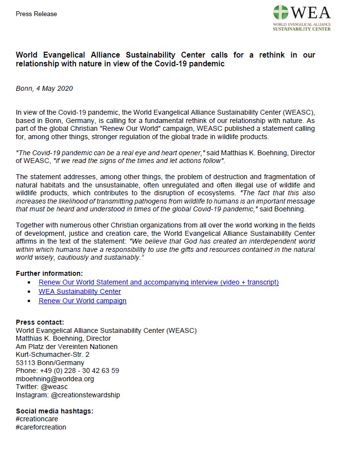 In particular, we note that both the destruction and fragmentation of natural habitats, and also unsustainable, often unregulated, and frequently illegal use of wildlife and wildlife products contributes to the disruption of ecosystems and the likelihood of pathogens transferring to humanity from wild animals. We recognise that many human societies, including some indigenous and traditional peoples, depend on wildlife products for food and medicine, and we call for full implementation of national and international laws against the illegal wildlife trade, and better regulation of legal wildlife commerce, for the good of human health and for nature’s flourishing. Alongside this, we urge Christian communities worldwide to teach the inherent value of all creatures to God and to encourage virtues of compassion, caution and care in relation to the human use of nature and its constituent parts.